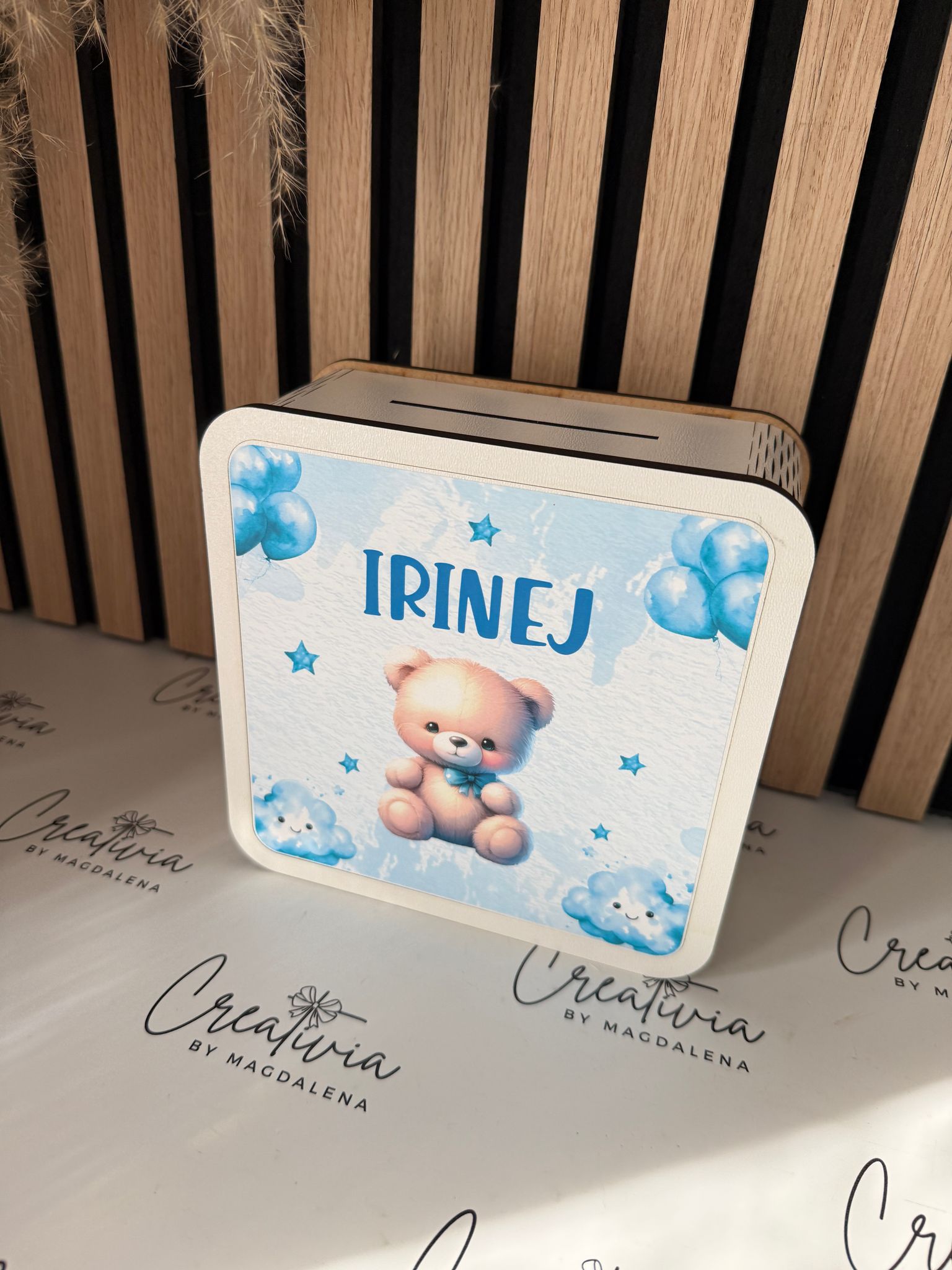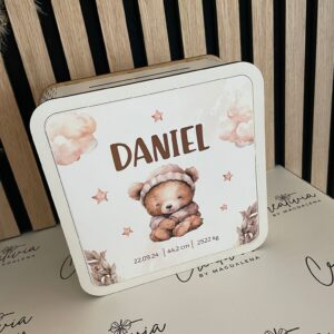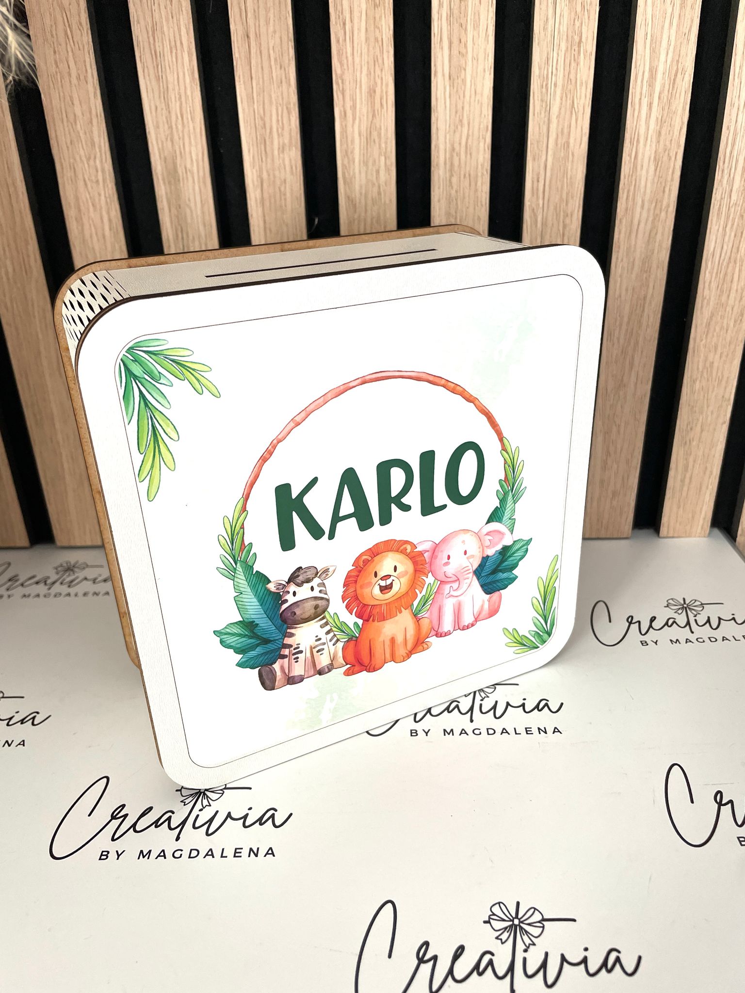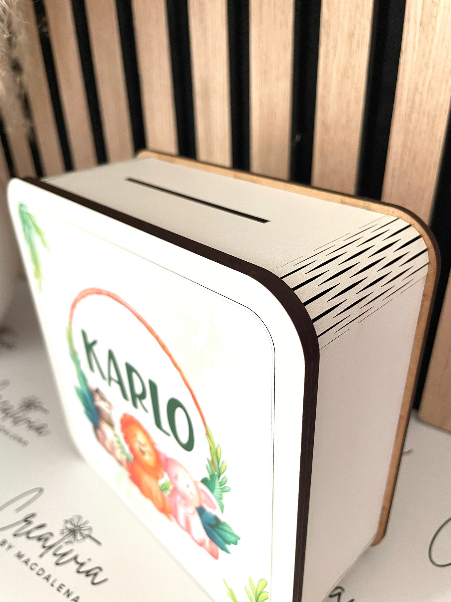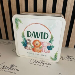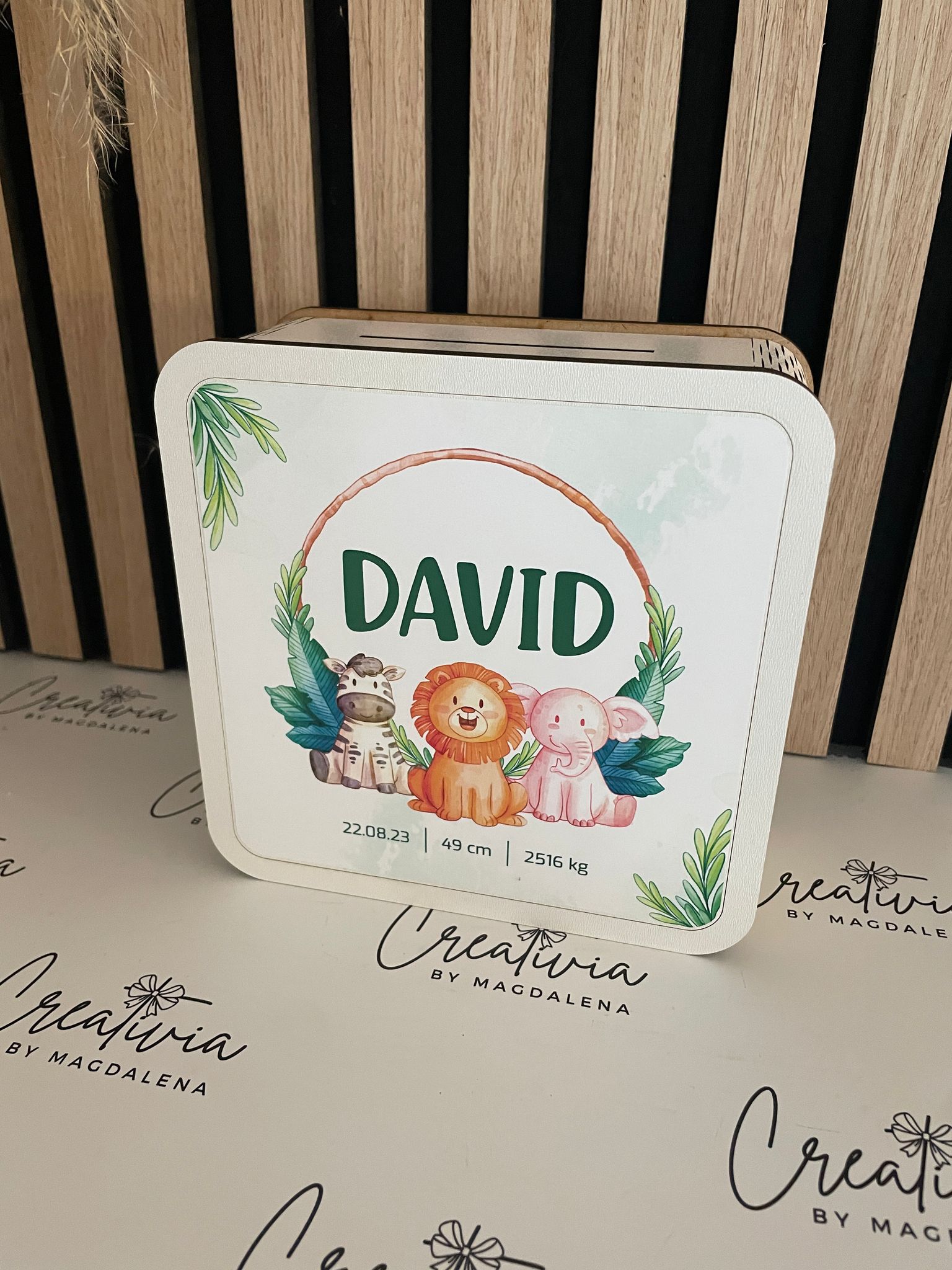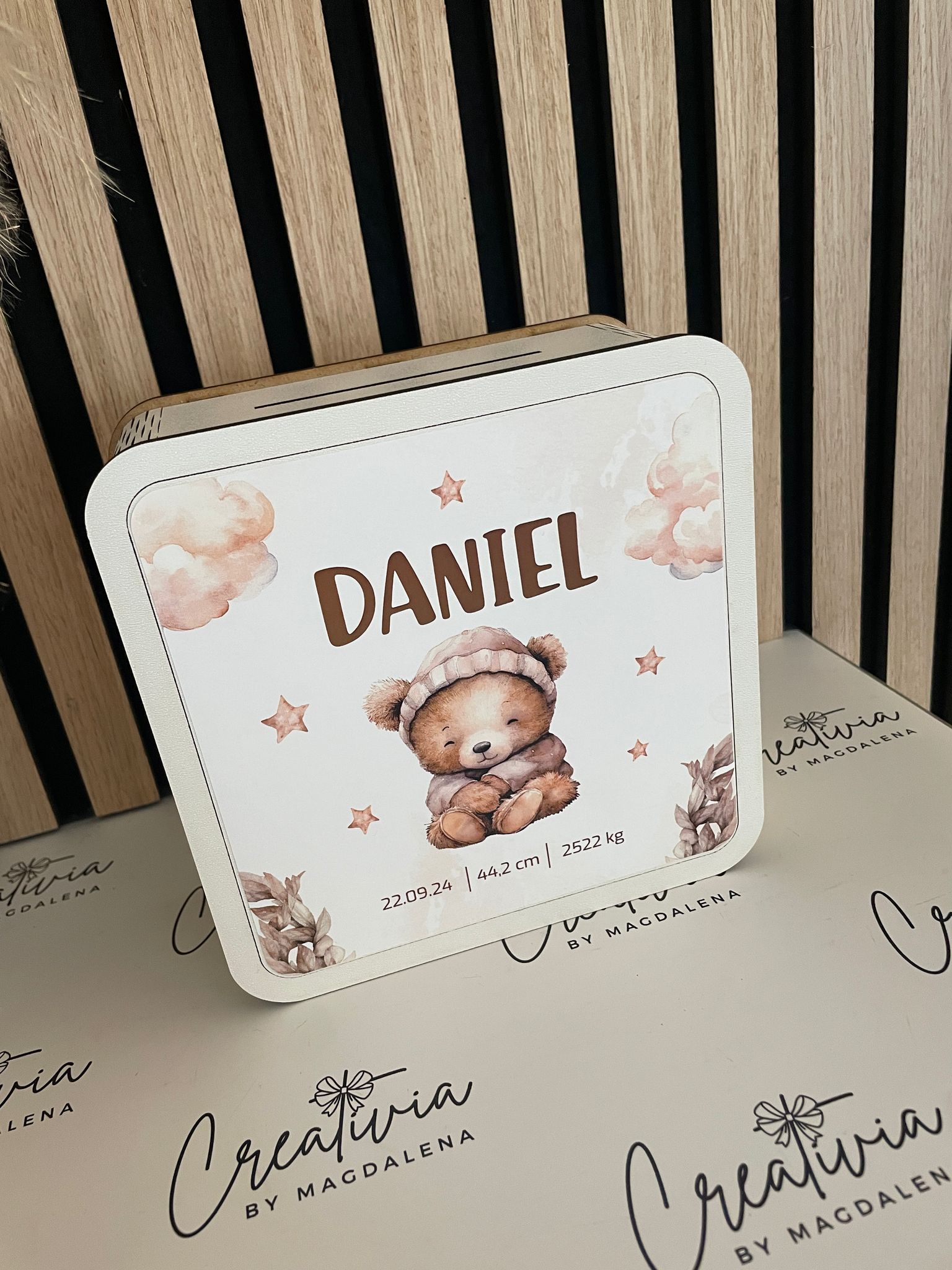 Ein liebevoll zusammengestelltes Geschenkset zur Geburt – enthält eine Spardose und eine weiche Babyhaarbürste, beide individuell mit dem Namen des Kindes graviert.