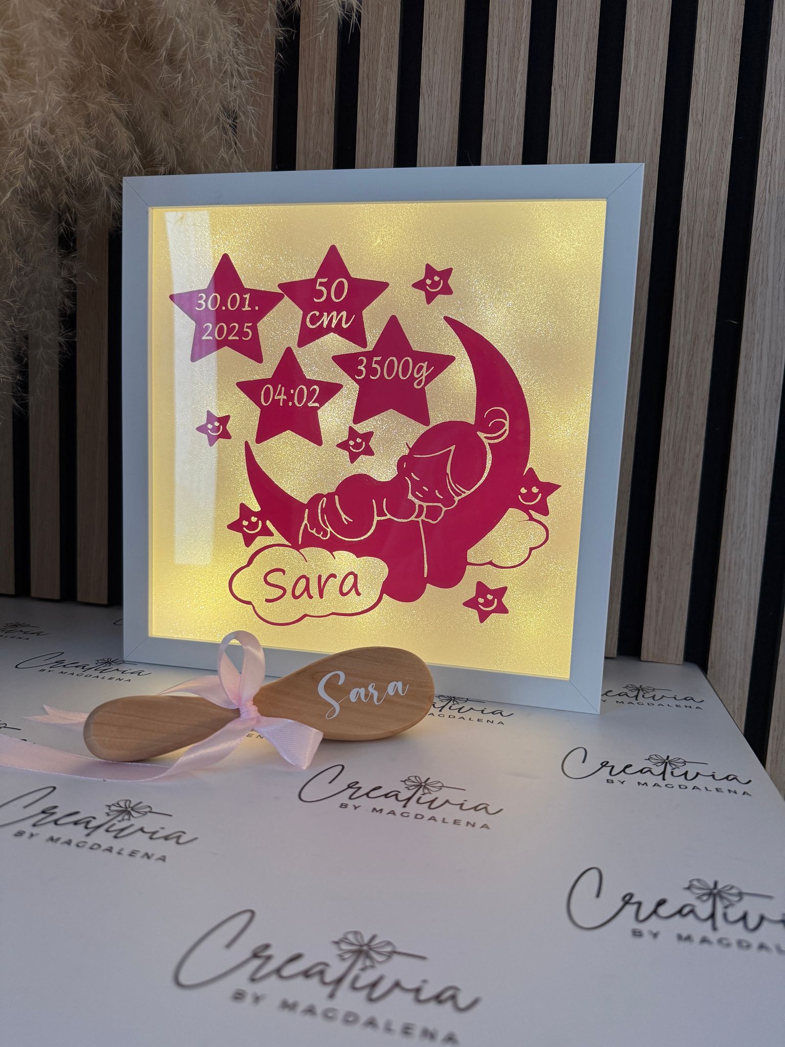 Dieses personalisierte LED-Bild ist ein zauberhaftes Erinnerungsstück für das Kinderzimmer, das mit dem Namen des Kindes sowie Geburtsdaten wie Geburtszeit, Gewicht und Länge graviert wird.