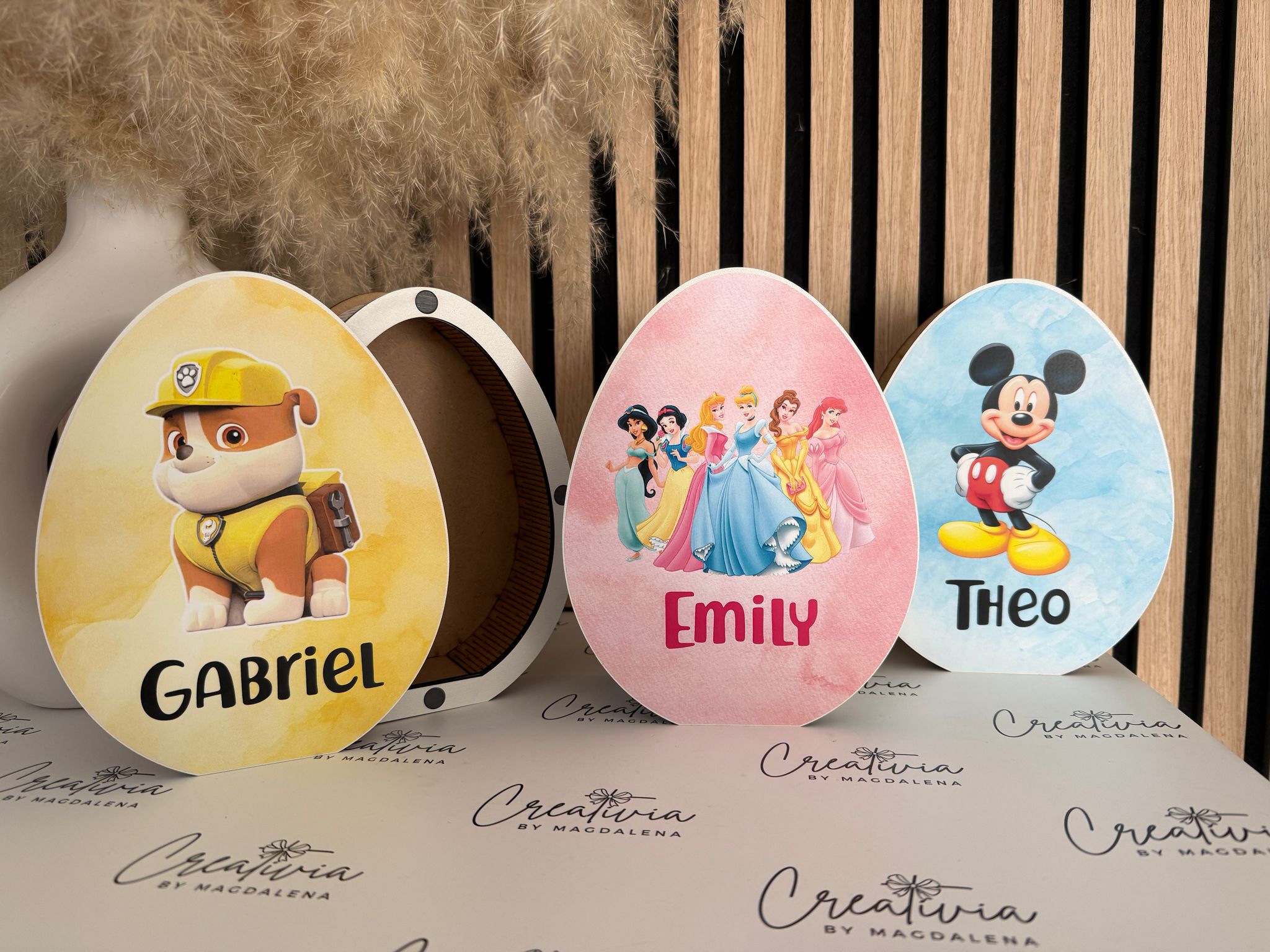 Große Ei-Box wie ein Überraschungsei – individuell mit Namen und Wunschfigur (z. B. Paw Patrol, Disney) gestaltet.